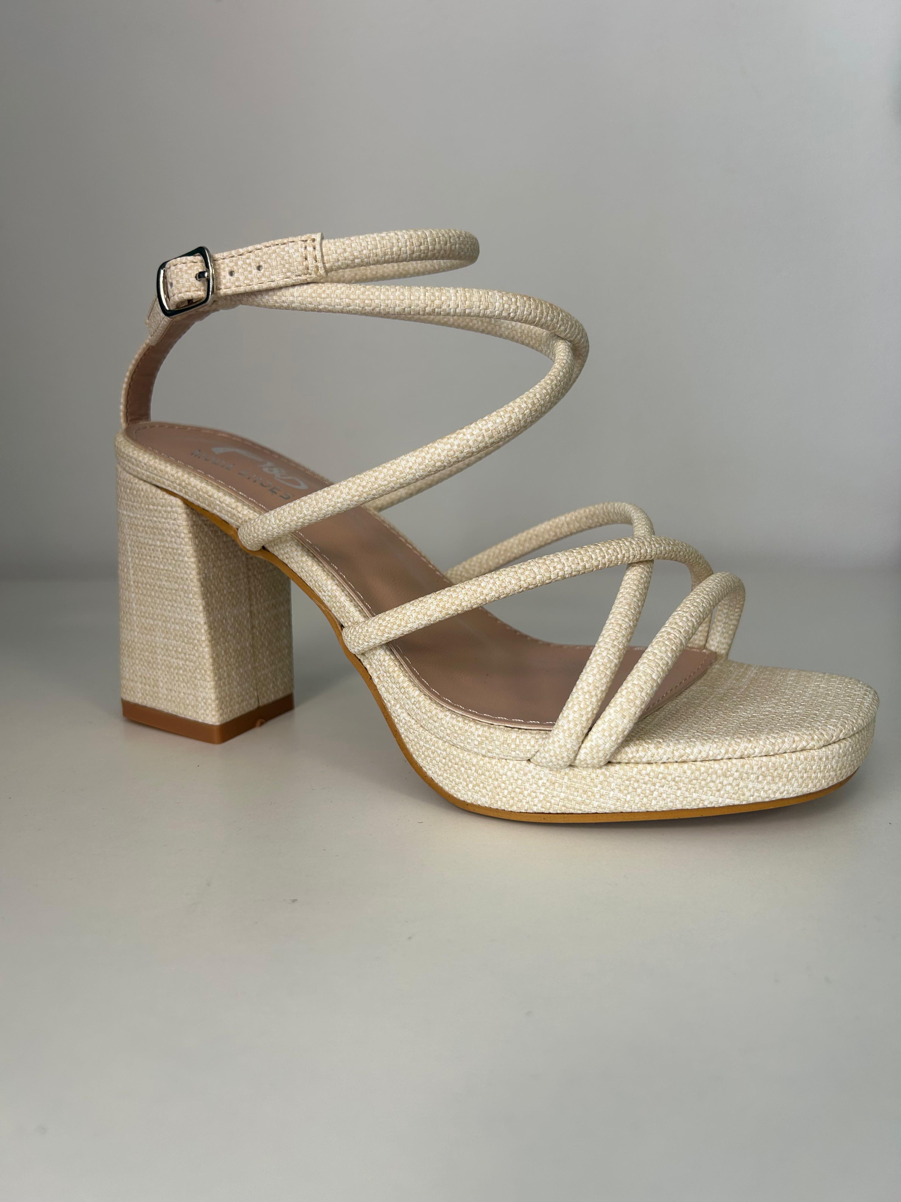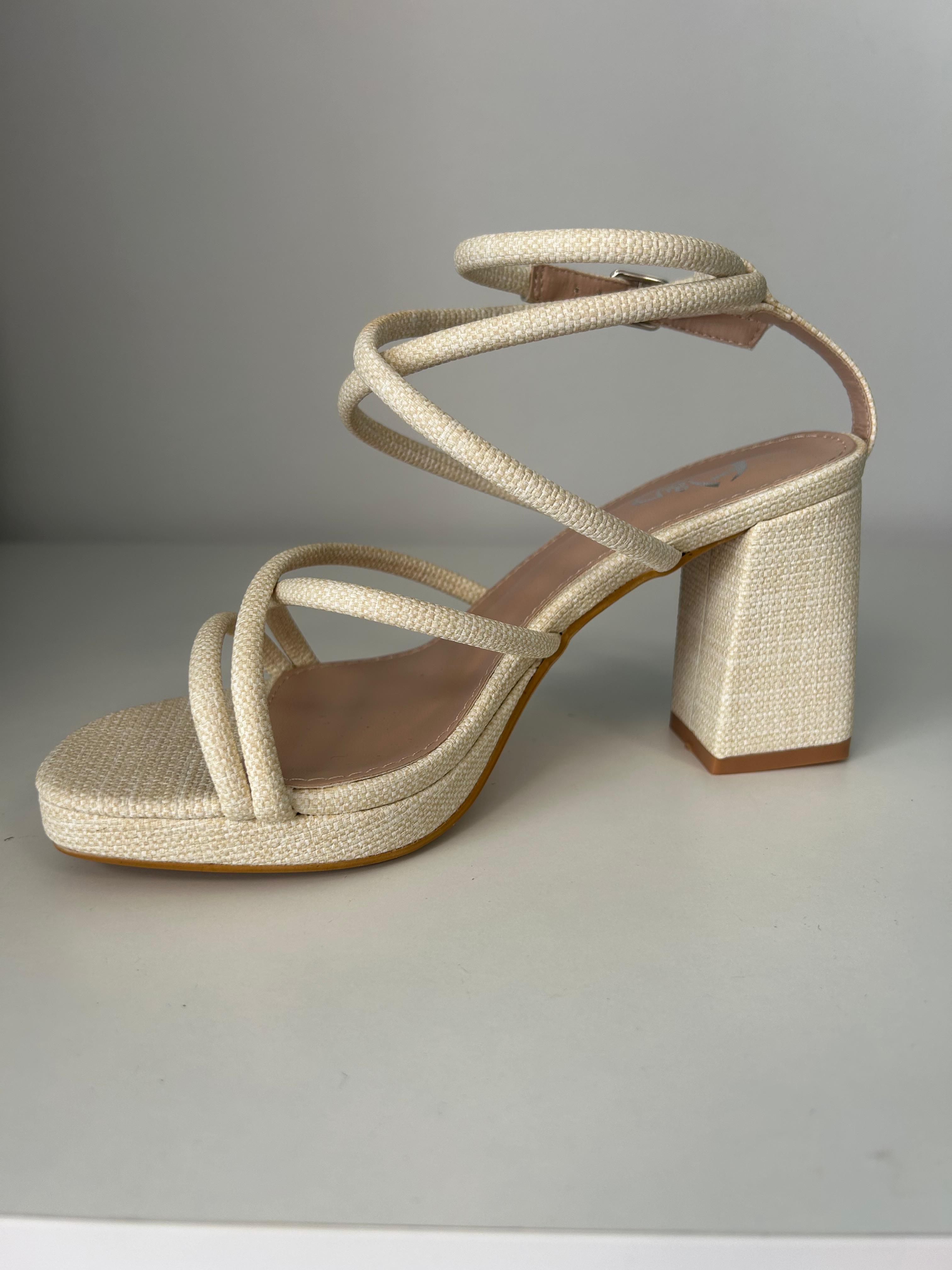Sandalia destalonada de tiras cruzadas en color beige en crudo. Tacón ancho de 9 centímetros. Desde el 36 al 41.