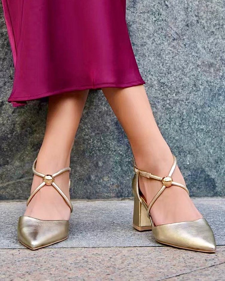 Stiletto dorado con tiras cruzadas y cierre al tobillo. Tacón cuadrado de 6,5 cm. Desde 36 a 41.