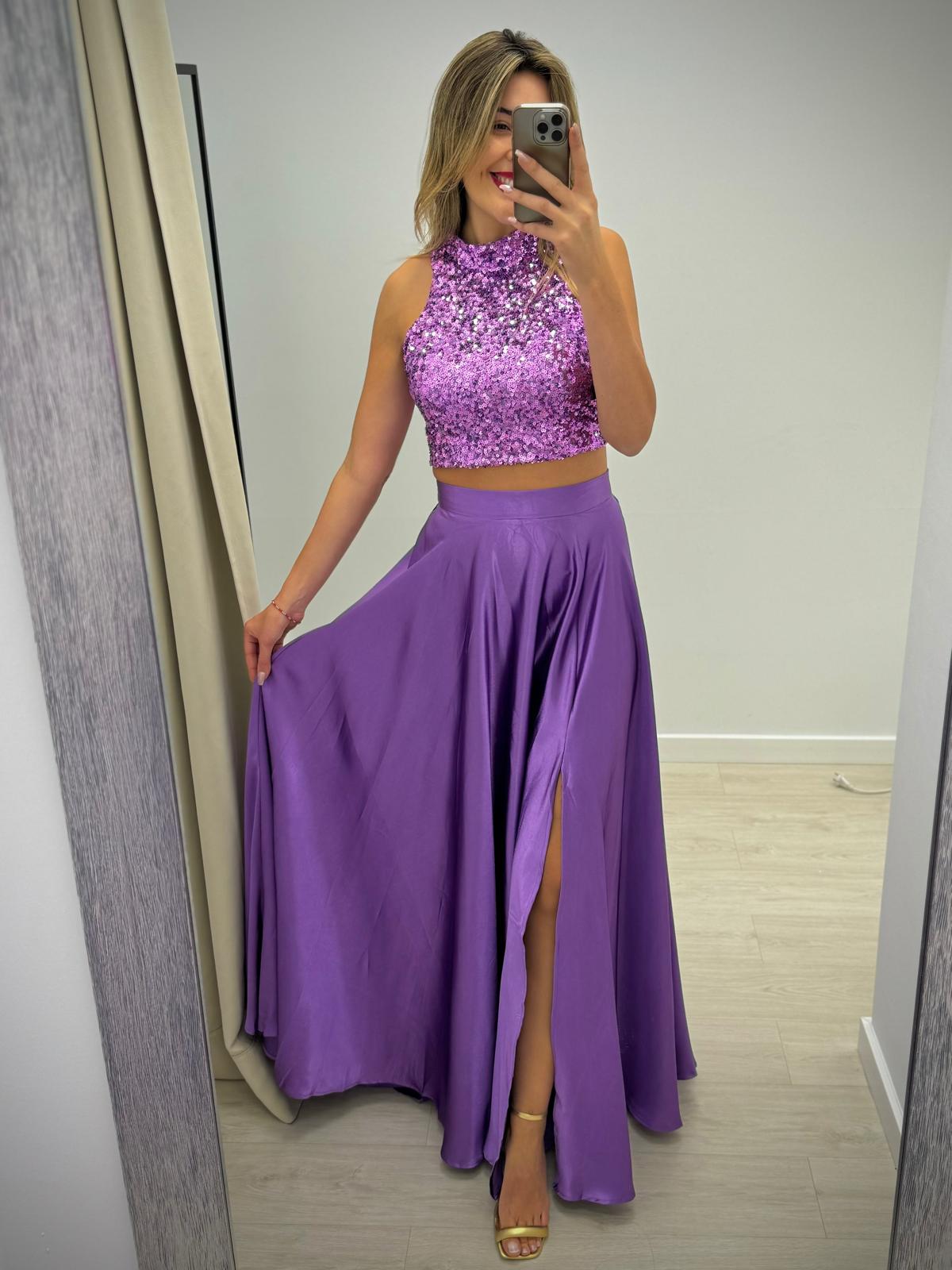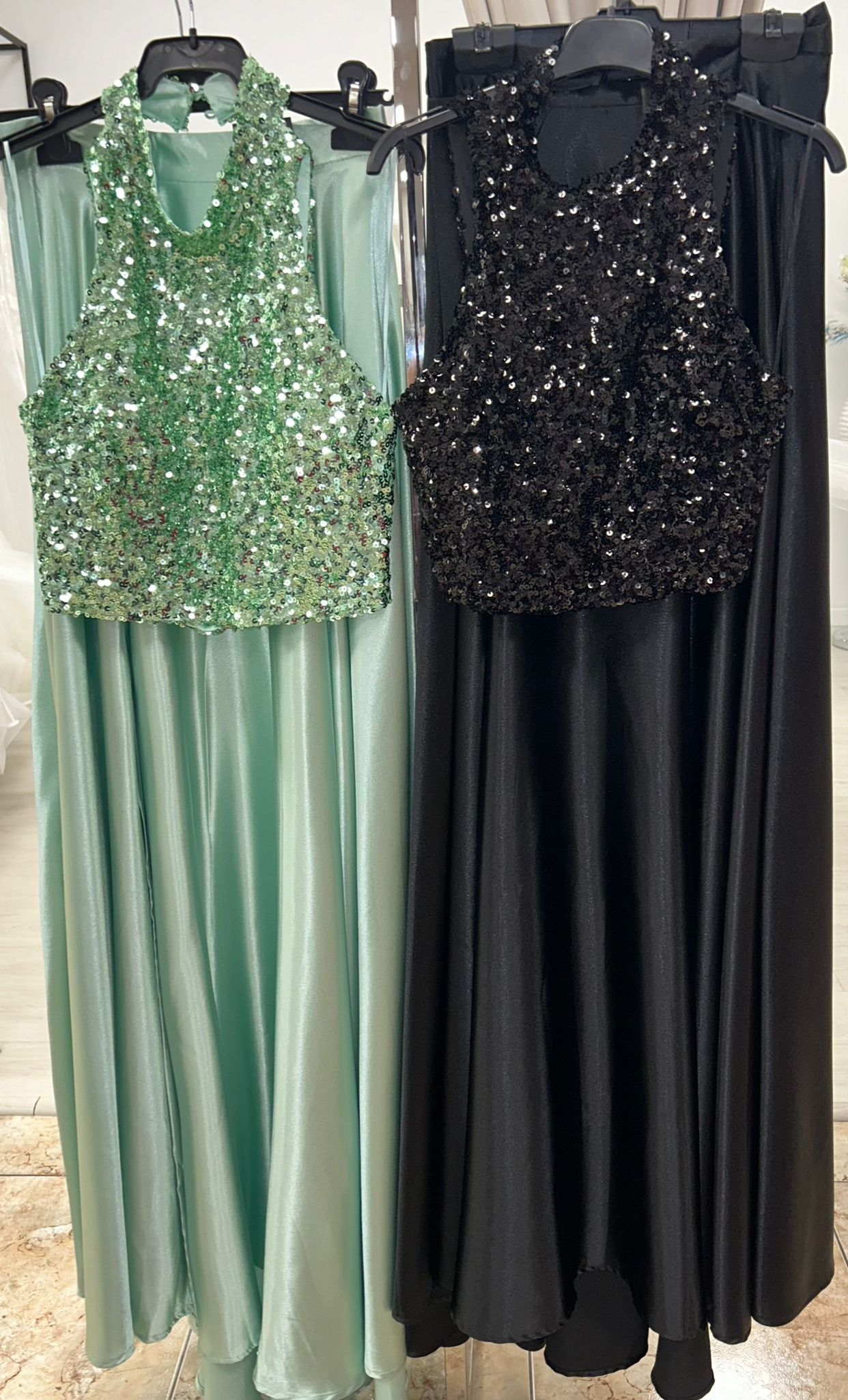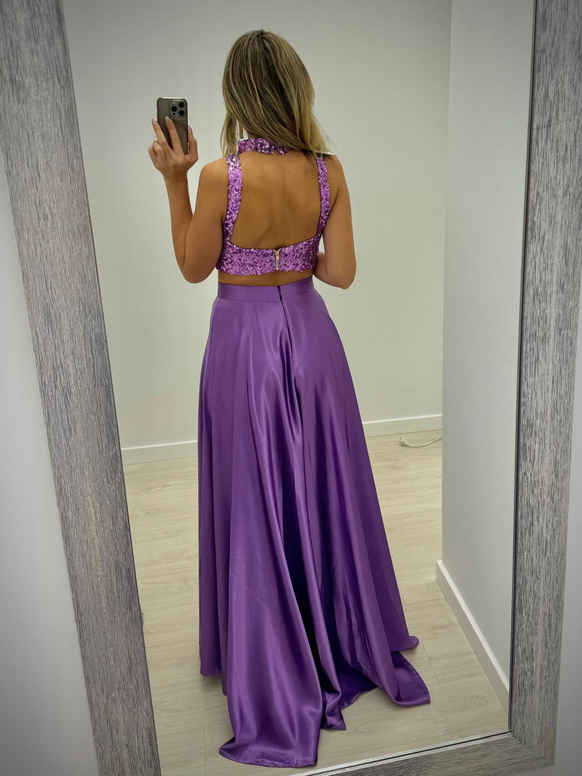 Conjunto top de cuello halter de lentejuela y falda de satén. El top y la falda contienen cremallera en la parte trasera. Disponible en color: negro, lila y verde menta. Por tallas: S M y L.