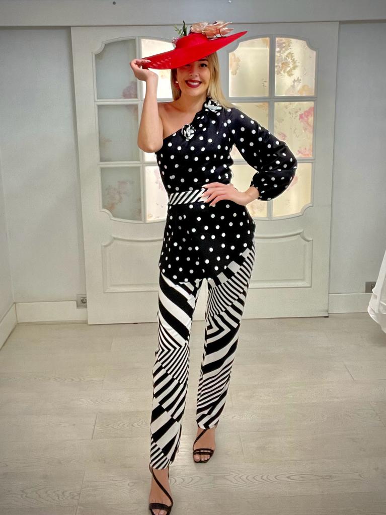 Conjunto de 2 piezas: Camisa de corte asimétrico con estampado de rayas y pantalón recto con estampado de lunares. Tejido, diseño y fabricación 100% Nacional. Por tallas: 40 42 44 46 48 50
