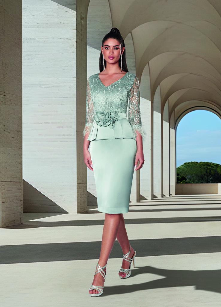 Vestido tamaño midi de color plata con detalle en encaje en la parte superior del vestido y detalle en plumas en las mangas del mismo tono que el vestido. Contiene cremallera en la parte trasera. Tejido, diseño y fabricación 100% Nacional. Por tallas: 42 44 46 y 48.