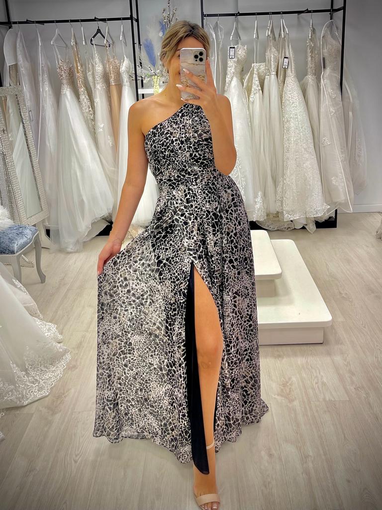 Vestido largo asimétrico con estampado en tonos negros, grises y bronce. Contiene cremallera lateral y abertura en la parte delantera. Tejido, diseño y fabricación 100% Nacional. Por tallas: 36 38 40 42 y 44.