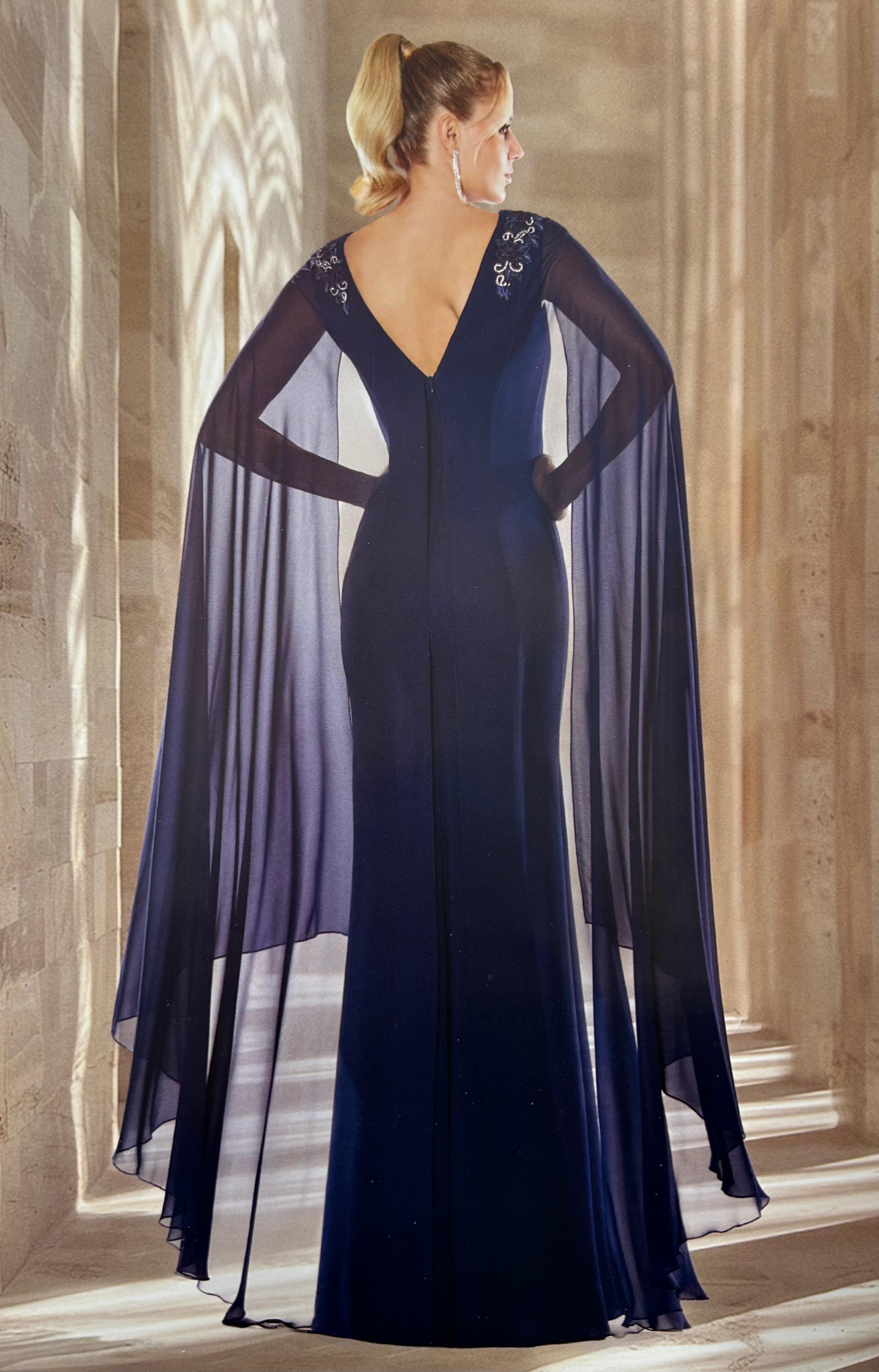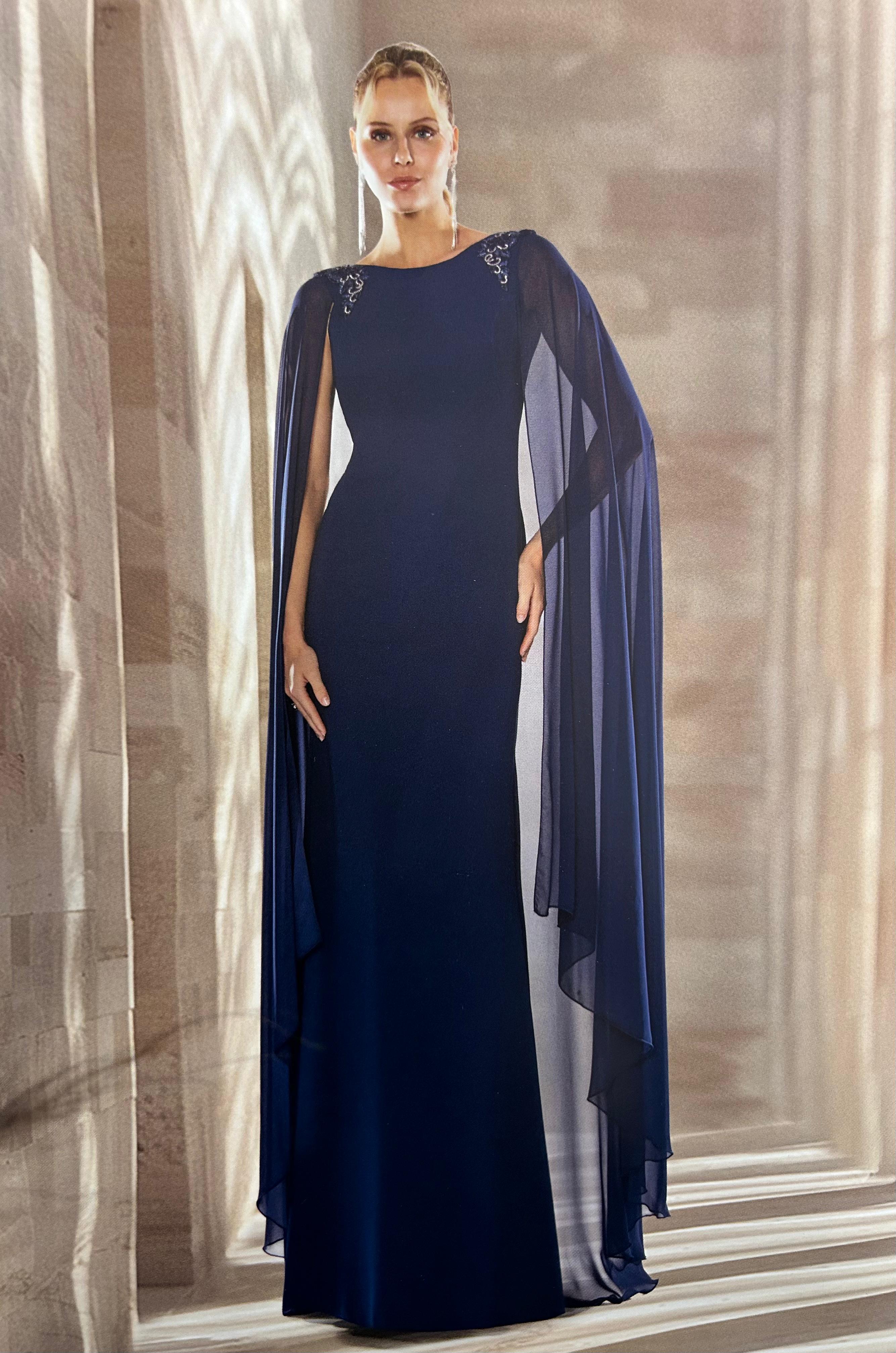 Vestido largo con mangas en forma de capa ideal para madrina con detalle de pliegue con pedrería en los hombros. Contiene cremallera en la parte trasera. Tejido, diseño y fabricación 100% Nacional. Por tallas.