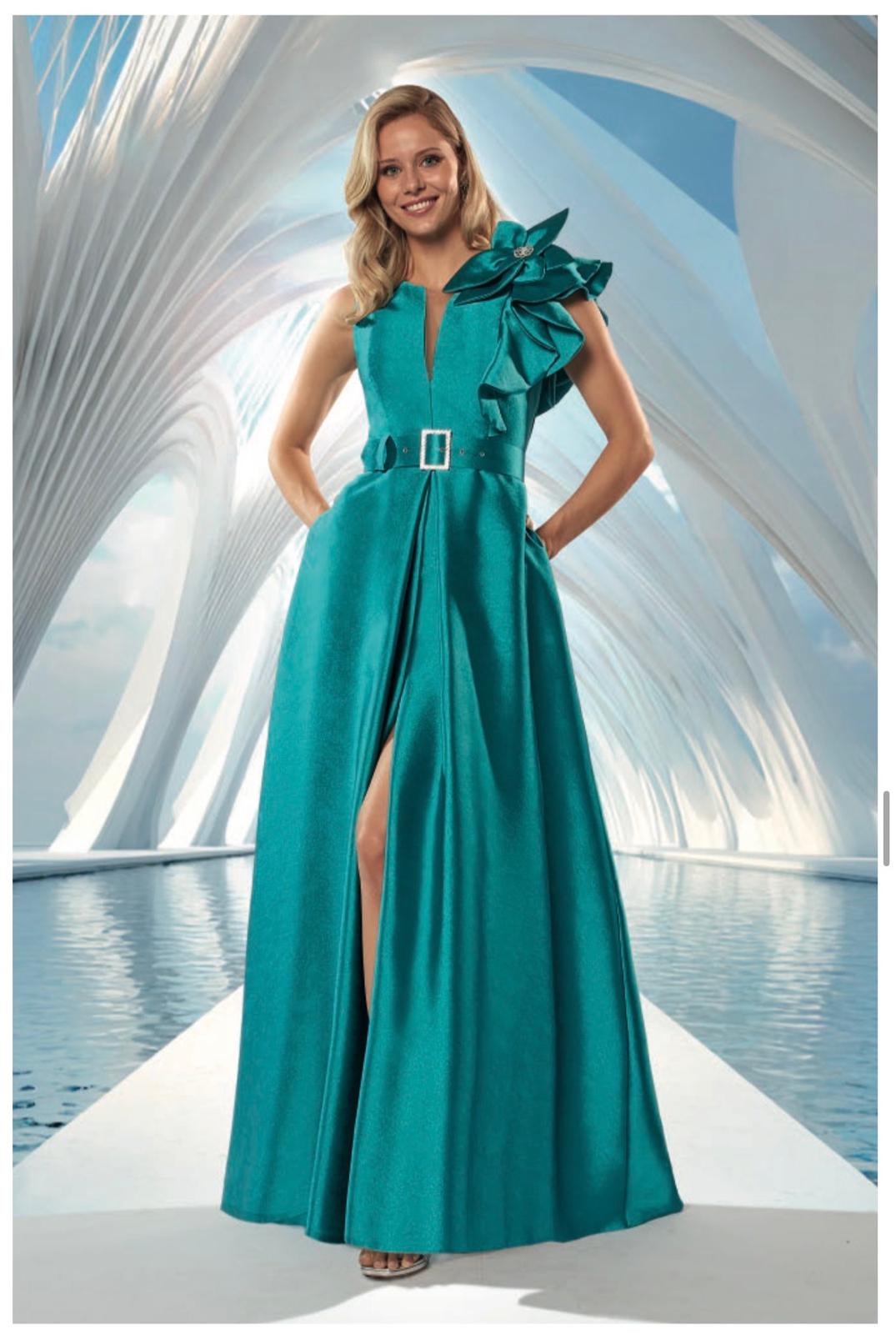 ref803 Vestido largo de madrina en tejido brocado, escote en pico y con detalle de volante en un hombro. Contiene cremallera en la parte trasera, abertura en la parte delantera y cinturón al tono con detalles en strass. Disponible en color turquesa. Modelo ideal para madrinas e invitadas de boda. Tejido, diseño y fabricación 100% Nacional. Por tallas.
