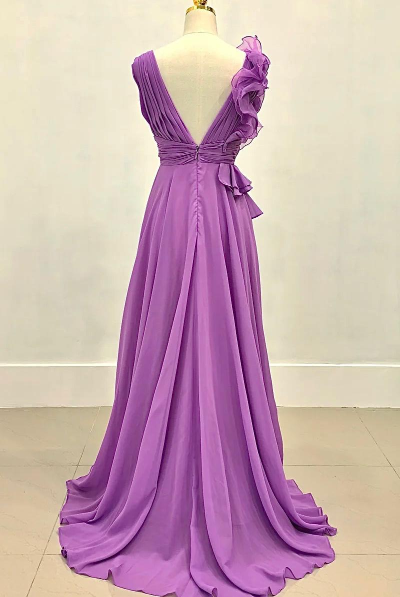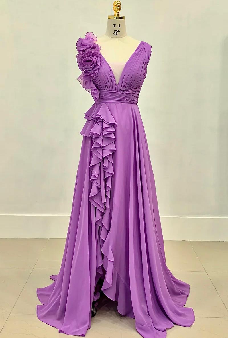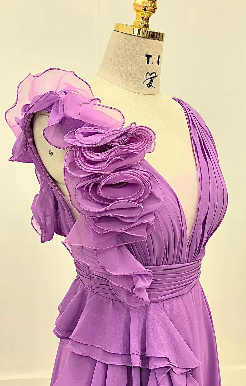 Vestido de gala largo en tejido de gasa con abertura lateral y chorrera en cascada. Por tallas: 36 38 40 42