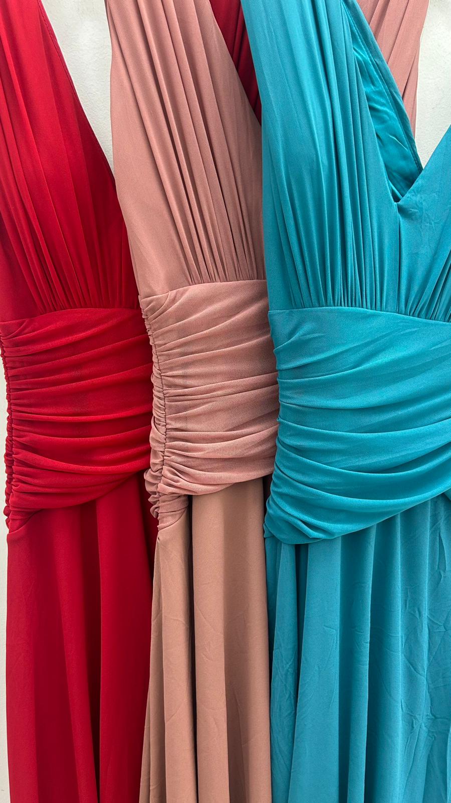 2601 Vestido largo de tul sin mangas, con escote en forma de V y drapeado en la zona de la cintura . Contiene cremallera en la parte trasera y abertura en la parte delantera. Ideal para orla, damas e invitadas de boda. Disponible en color: turquesa , fucsia, verde agua grisáceo, azul klein, rosa, rojo y petróleo. Por tallas: s/m m/l l/xl xl/2xl 2xl/3xl 3xl/4xl