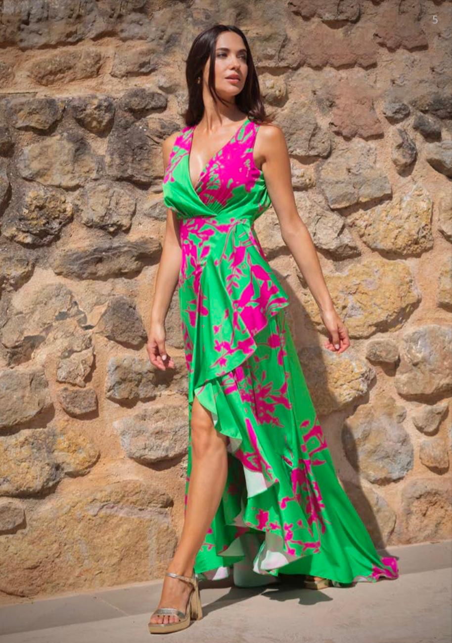 Vestido largo estampado sin mangas en color verde y fucsia, con espalda descubierta y detalle en volante en la falda. Contiene cremallera trasera y abertura delantera. Tejido, diseño y fabricación 100% Nacional. Por tallas.