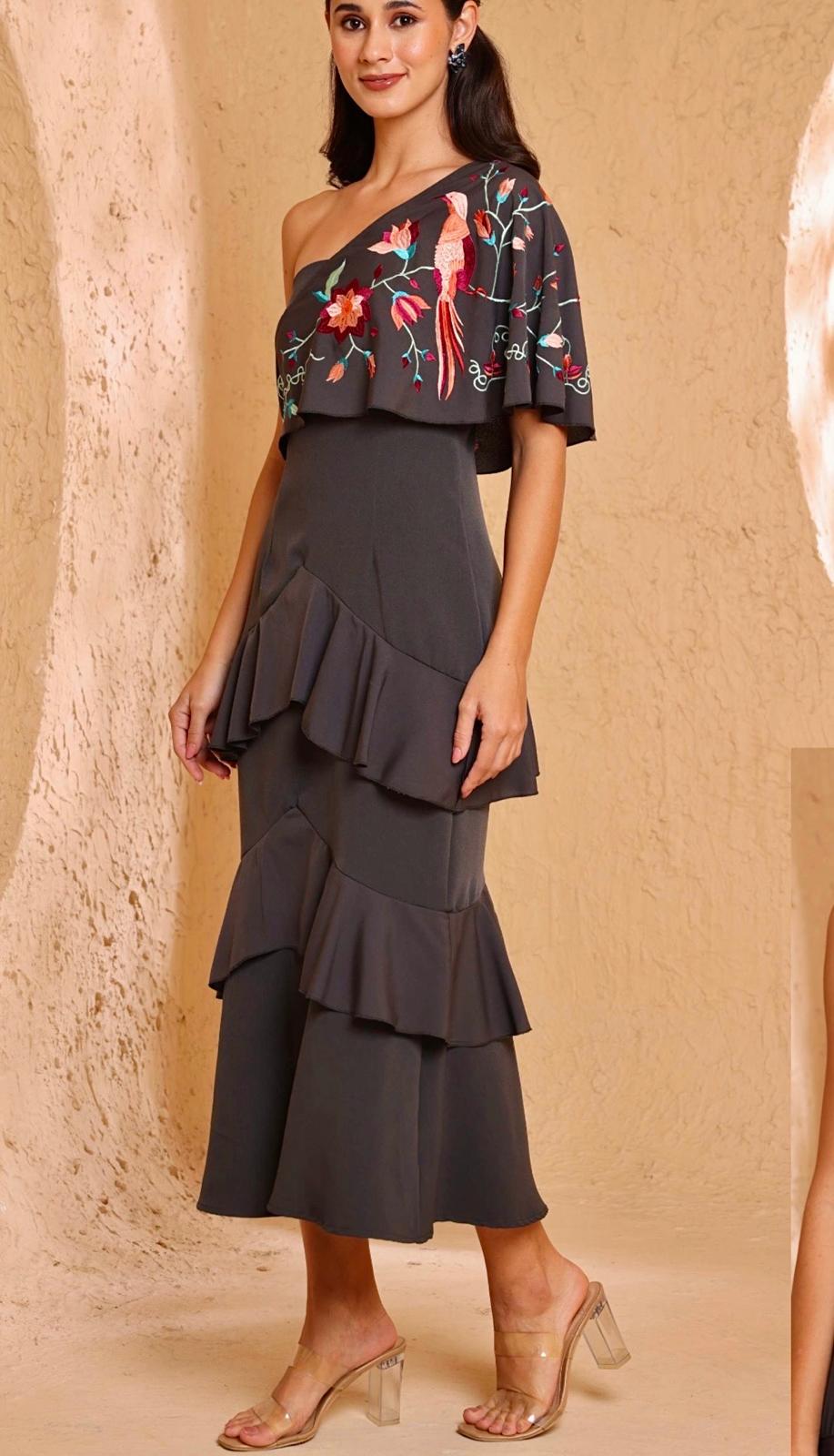 ref2650 Vestido midi asimétrico de color gris, con bordado en la parte superior y con volante en cascada en la falda. Tejido, diseño y fabricación 100% Nacional. Por tallas: s m l xl.