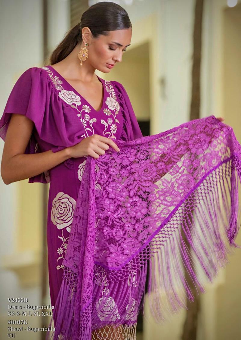 ref2455 Vestido midi gasa crepada color buganvilla con flores bordadas en tono champán y terminación en flecos. Tejido, diseño y fabricación 100% Nacional. Por tallas: s m l xl xxl xxxl