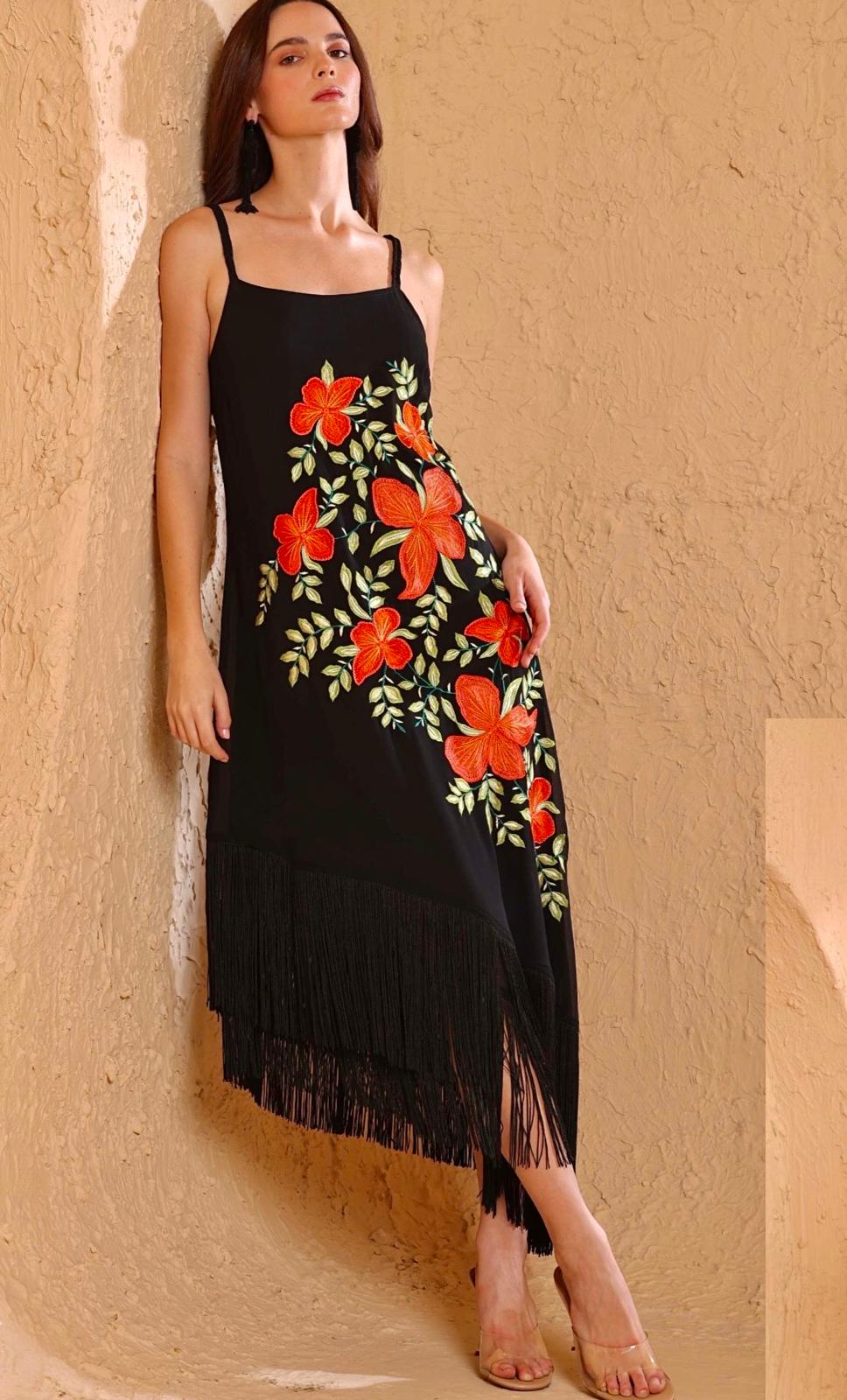 ref2643 Vestido midi de asillas en color negro , con detalles bordados en color naranja y verde y con terminación en flecos. Tejido, diseño y fabricación 100% Nacional. Por tallas: s m l xl.