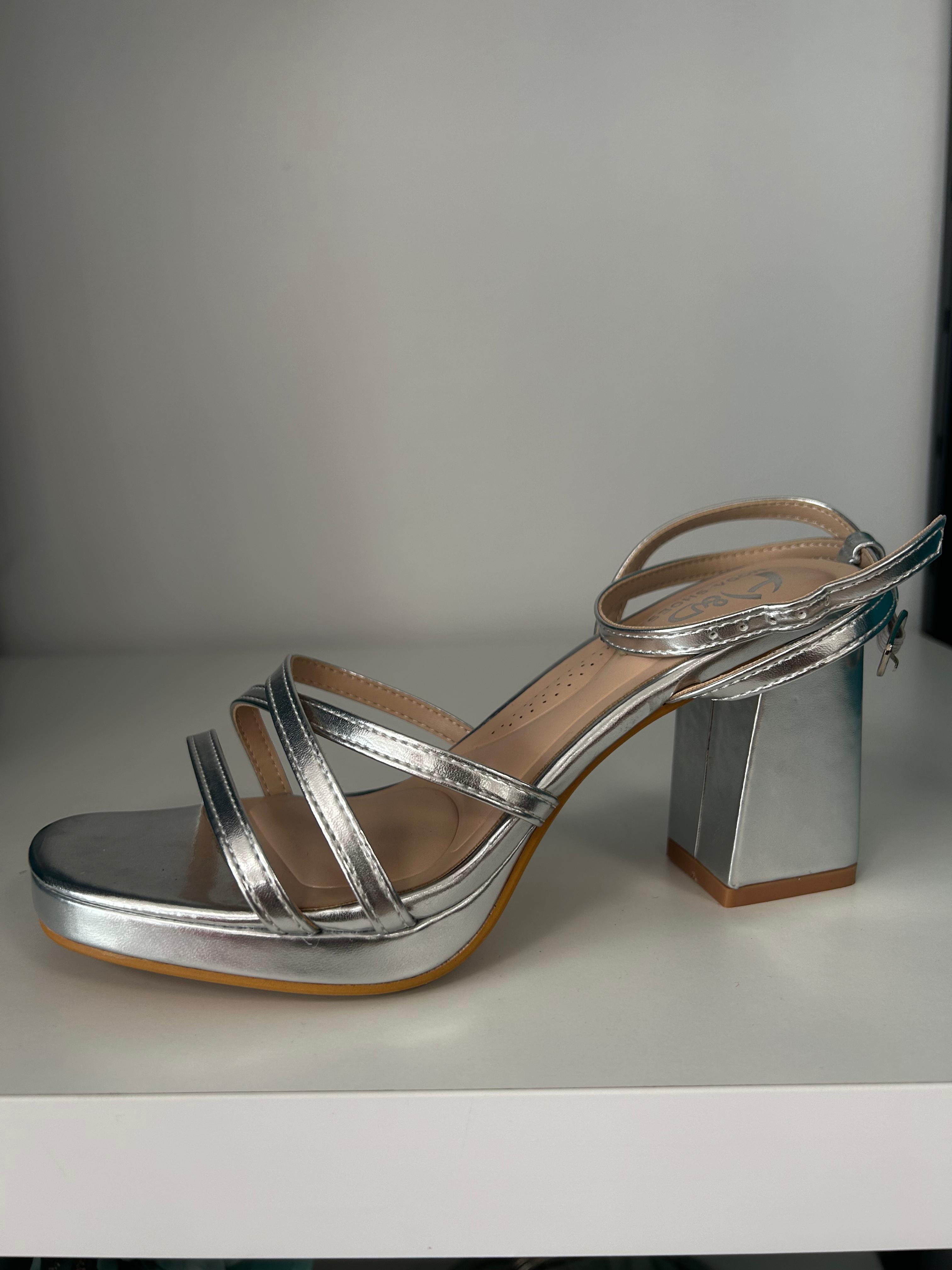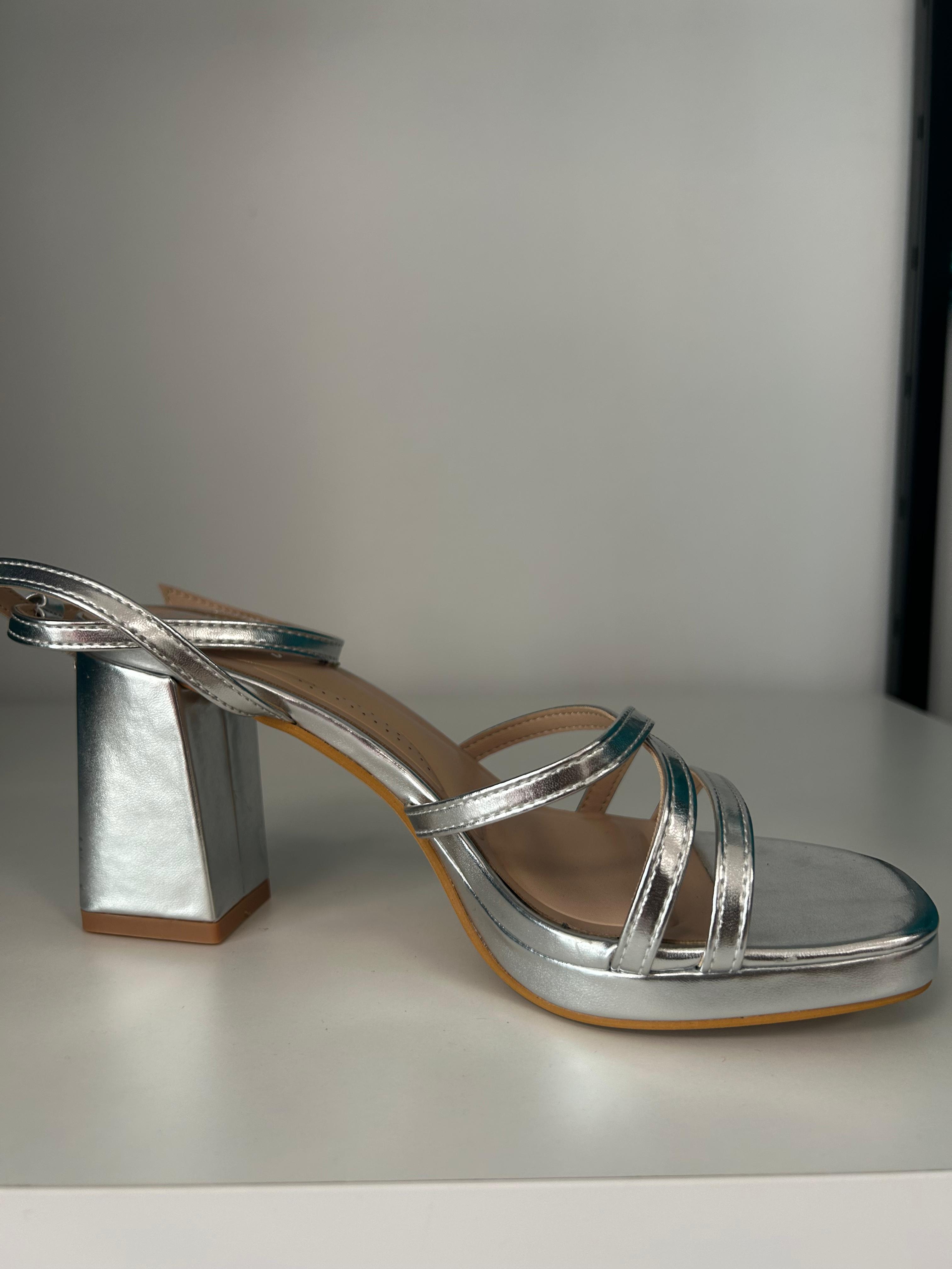 Sandalia destalonada de tiras cruzadas en color plata. Tacón ancho de 9 centímetros. Desde el 36 al 41.